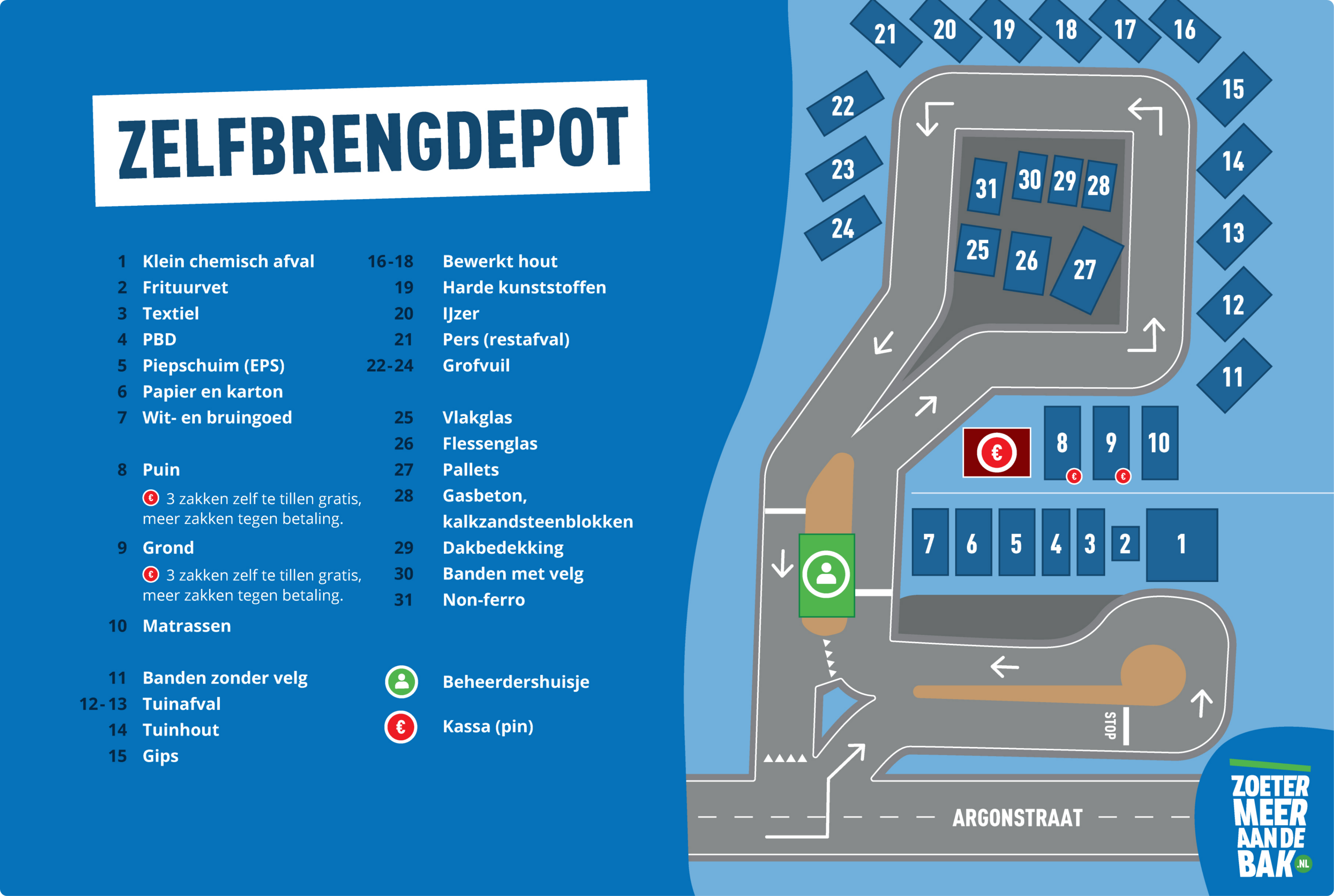 Op het Zelfbrengdepot kunt je twee stops maken. Bij de eerste stop, beneden, levert je klein chemisch afval, wit- en bruingoed, glas, textiel, papier en karton en PBD in. Tip; laad de auto of aanhangwagen zo in, dat je dit soort afval als eerst kunt pakken. De rest van het afval kunt je op de tweede stop kwijt.